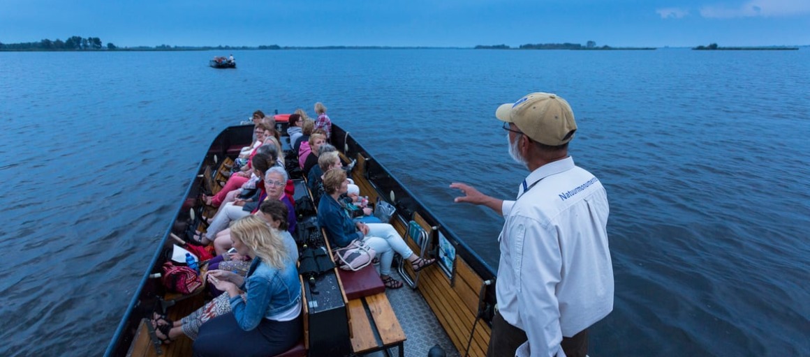 Stap aan boord van onze excursieboot en ervaar de bijzondere sfeer op het water aan het einde van de dag. Je hoort alleen het ruisen van het riet en de vogels, zelfs de boot fluistert tijdens deze tocht.